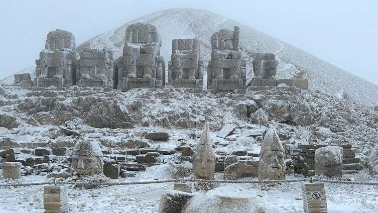 Milli Park Alanı olarak korumaya alınan ve eşsiz heykellerin yanı sıra 2 bin 150 metre yüksekliğiyle "Güneşin doğuşunun ve batışının en güzel izlendiği yer" olarak bilinen Nemrut Dağı'nda, kar yağışıyla kartpostallık görüntüler ortaya çıktı.