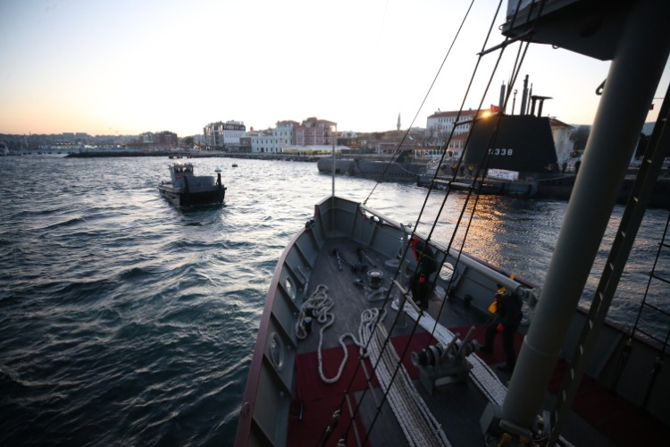 Çanakkale Deniz Müzesi Komutanlığı Yüzer İskelesi'nde demirli bulunan "TCG Nusret (N-16)", mayınlarını döktüğü rotada ilerledi.