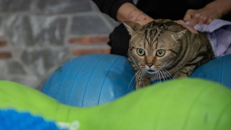 Dökmeci, fazla beslenme ve hareketsizliğe bağlı kilo alan kedisine pilates yaptırmayı başaramayınca onu veteriner fizik tedavi ve rehabilitasyon merkezine götürdü.