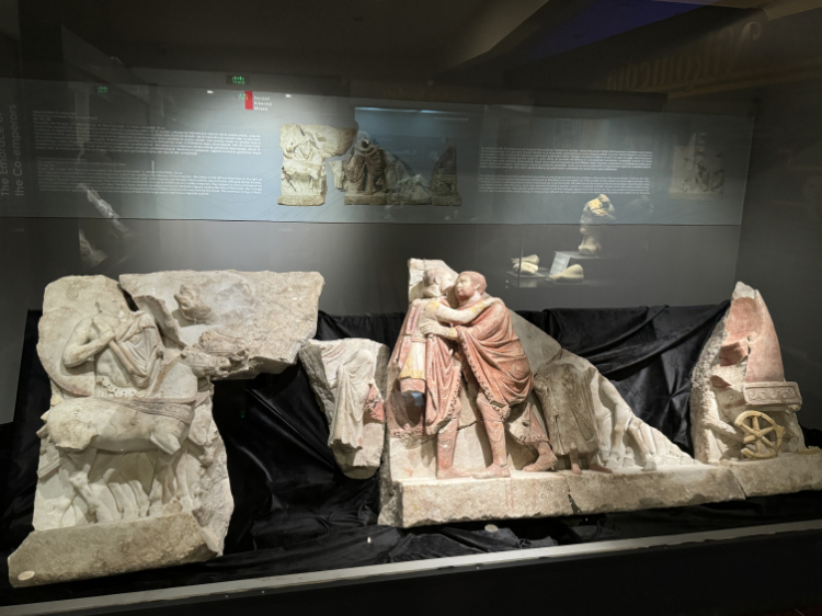 Aynı dönemde bulunan ve 10 ayrı kırık parçadan bir araya getirilerek restore edilen, Roma İmparatorları Diokletianus ve Maximianus'un şehre girişte yapılan geçit töreninde tören arabasından inerek birbiriyle kucaklaştığı sahnenin tasvir edildiği rölyef ise 23 yıl sonra tarih ve sanatseverlerin ilgisine sunuldu.
