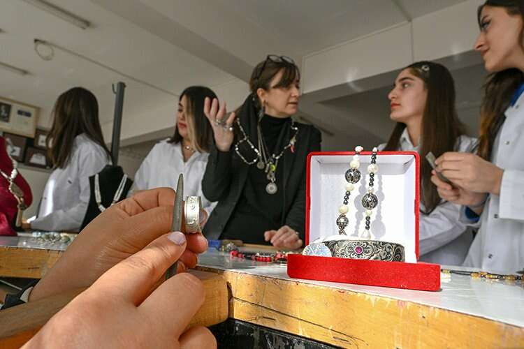 Atölyede 8 ay boyunca savat ve takı tasarım sanatçılarından teorik ve pratik eğitimler alan 16 kız öğrenci, bölge gezileriyle tarihi desen ile motifleri inceleyerek tasarımlarına yansıttı.