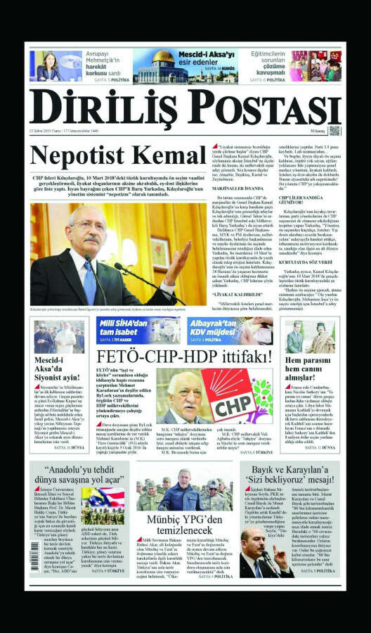 'Diriliş Postası' isimli bir mevkute var. 17 Cemaziyelahir 1440, yani 22 Şubat 2019 tarihli sayısında 'Nepotist Kemal' başlıklı bir neşriyatı manşete çekmişler.