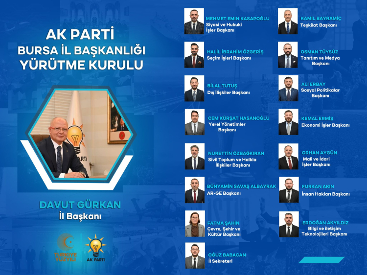 Mehmet Kasapoğlu Siyasi ve Hukuk İşleri Başkanı, Kamil Bayramiç Teşkilat Başkanı, Halil İbrahim Özgeriş Seçim İşleri Başkanı, Bilal Tutuş Dış İlişkiler Başkanı, Ali Erbay Sosyal Politikalar Başkanı, Cem Kürşat Hasanoğlu Yerel Yönetimler Başkanı, Kemal Ermiş Ekonomi İşler Başkanı, Nurettin Özbağkıran Sivil Toplum ve Halkla İlişkiler Başkanı, Orhan Aygün Mali ve İdari İşler Başkanı,Bünyamin Savaş Albayrak AR-GE Başkanı, Furkan Akın İnsan Hakları Başkanı, Fatma Şahin Çevre Şehir ve Kültür Başkanı, Erdoğan Akyıldız Bilgi ve İletişim Teknolojileri Başkanı, Oğuz Babacan İl Sekreteri...
