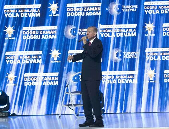 Erdoğan konuşmasını sık sık keserek partililere eşlik etti.