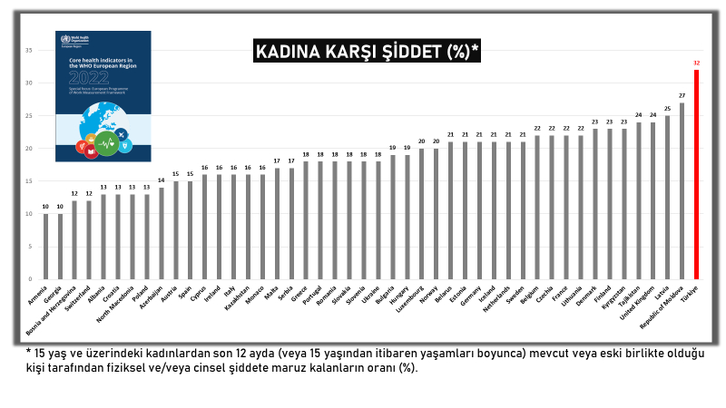 Dünya Sağlık Örgütü Avrupa Bölgesi tarafından açıklanan istatistiklere göre kadına karşı şiddet oranının en yüksek olduğu ülke Türkiye.