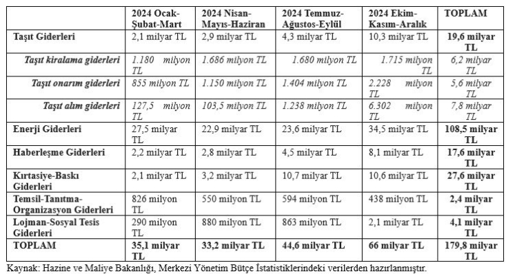 "2023’ten 2024’e taşıt kiralama ve onarım giderlerinde yüzde 136 oranında artış ortaya çıkarken, haberleşme giderlerinde artış yüzde 100 oldu. Kırtasiye-baskı giderleri ile lojman-sosyal tesis giderleri ise yüzde 70’e yakın artış gösterdi. Sonuçta, enflasyonla mücadelenin yükünü talebi ve tüketimi düşen ücretli, dar gelirli üstlenirken, kamunun harcamacı yapısı devam ediyor. Gerek enflasyonla mücadelede gerekse gelir dağılımındaki adalette çelişkili bir görünüm ortaya çıkmış durumda."