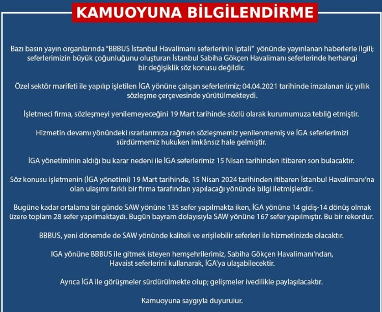 Yapılan açıklamada İstanbul Havalimanı yönetimi tarafından BBBUS seferlerinin durdurulacağı 19 Mart itibariyle ‘sözlü’ olarak BURULAŞ yönetimine iletilmiş…