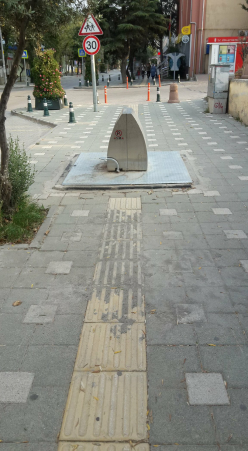 Ancak, ilçe belediyemiz bu çöp aparatını görme engelliler için özel çizgili zemin karoları ile yapılan yolun tam üzerine koydurdu..