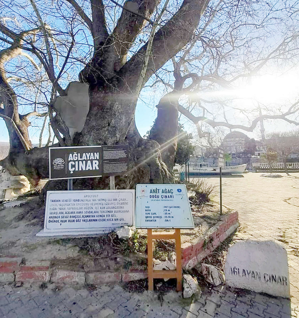 Üstelik mermer üzerindeki yazının bir kısmı da silik. Anıt olarak tescillemiş Ağlayan Çınar bu manzara içinde gerçekten ağlıyor sanki.