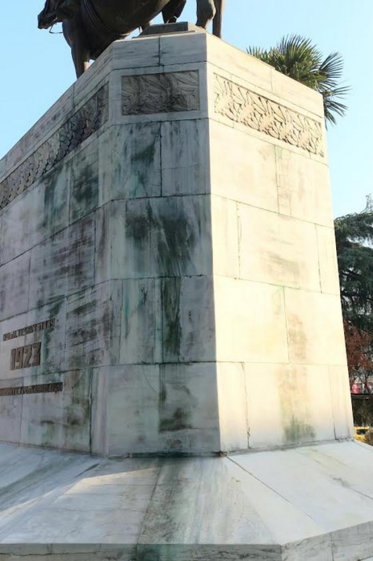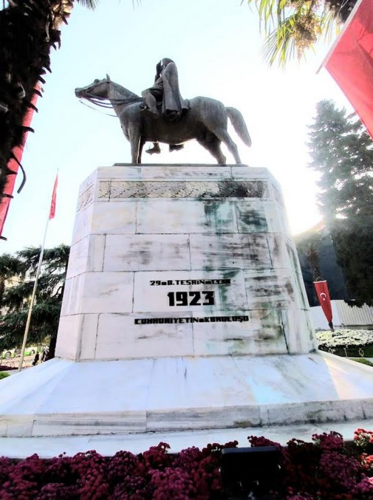 29 Ekim öncesi heykelin önündeki mermer merdivenler ve zeminde bozuk yerler onarıldı. Sıra kaideye de geliyor diye sevindik ama olmadı. Simsiyah mermer bloklar görülmedi. Öylece duruyor!.