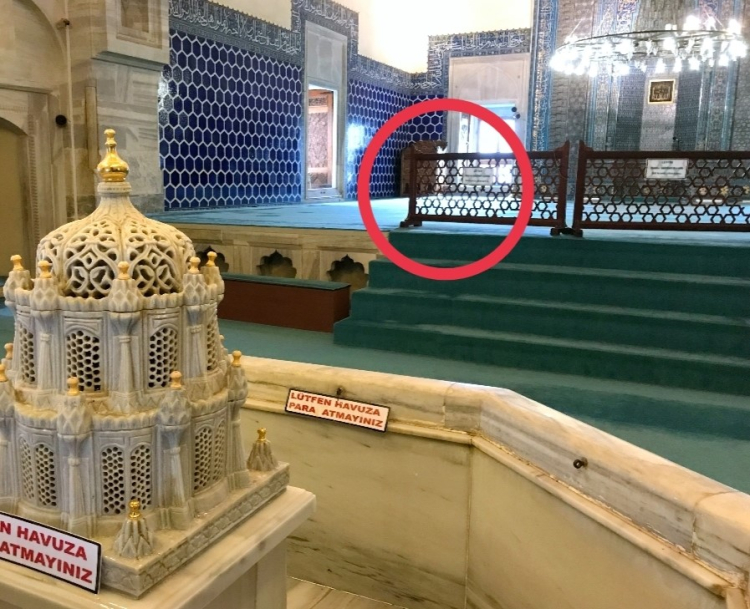 Durumu daha iyi anlatabilmek için fotoğraflardan üçünü de köşeme alıyorum. Kırmızı daire içindeki fotoda desenleri kırılmış pano caminin mihrap zeminine çıkılan merdivenlerin hemen yanında ve bu zeminin sonunda. Namaz sırasında vatandaş arkaya düşmesin diye konuyormuş.