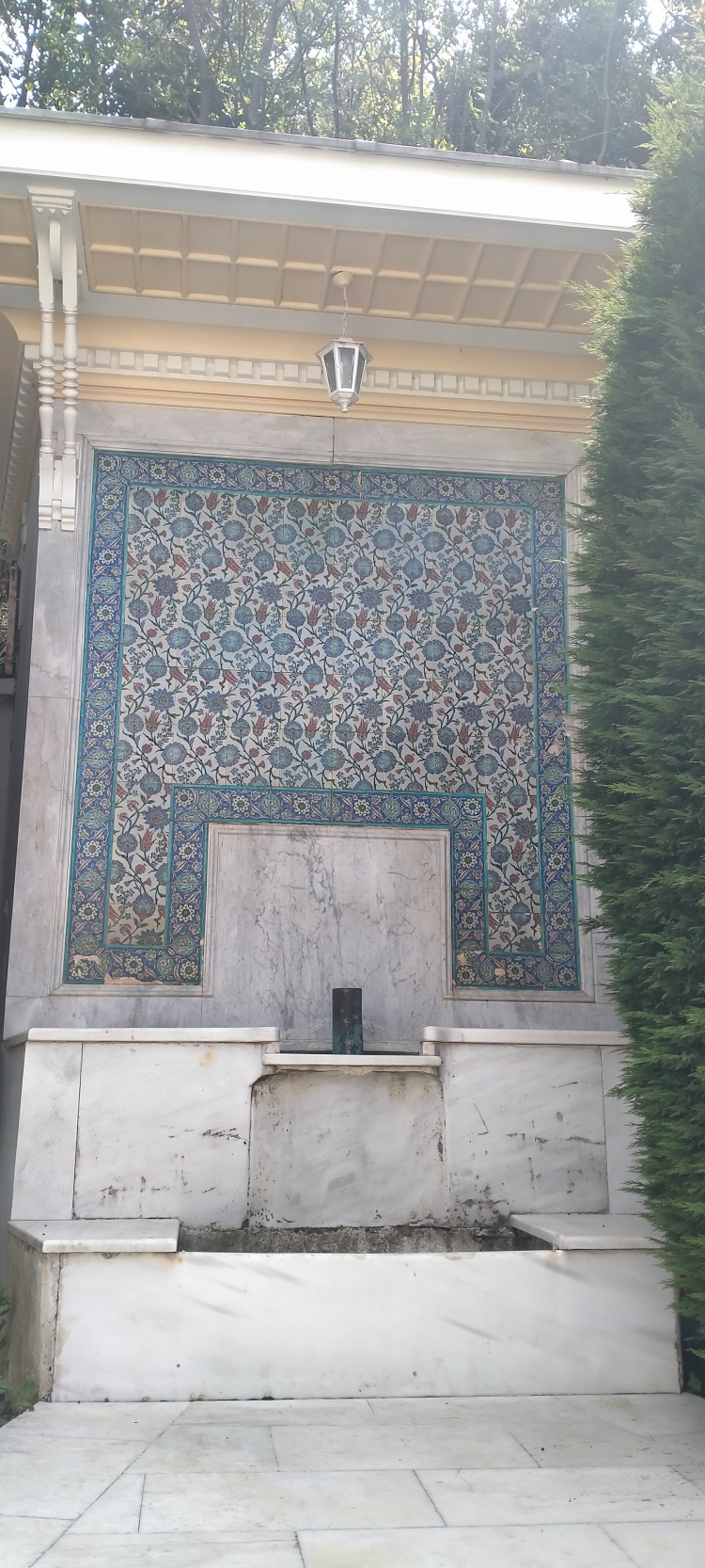 Köşkün bahçesinde şadırvanlı güzel bir çeşmenin fotosu. Aynasında İznik'in tarihi çini sanatının en güzel örneğinin yer aldığı büyük bir pano.Muazzam bir sanat eseri ait görsel bu.