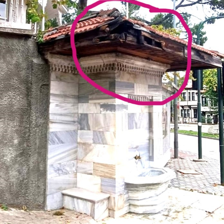 Bu çeşmenin saçağı tamanen çürümüş durumda... Damındaki kiremitler dökülüyor. Saçağın olduğu gibi göçme ihtimali mevcut. Onarımı acil ve zorunlu..