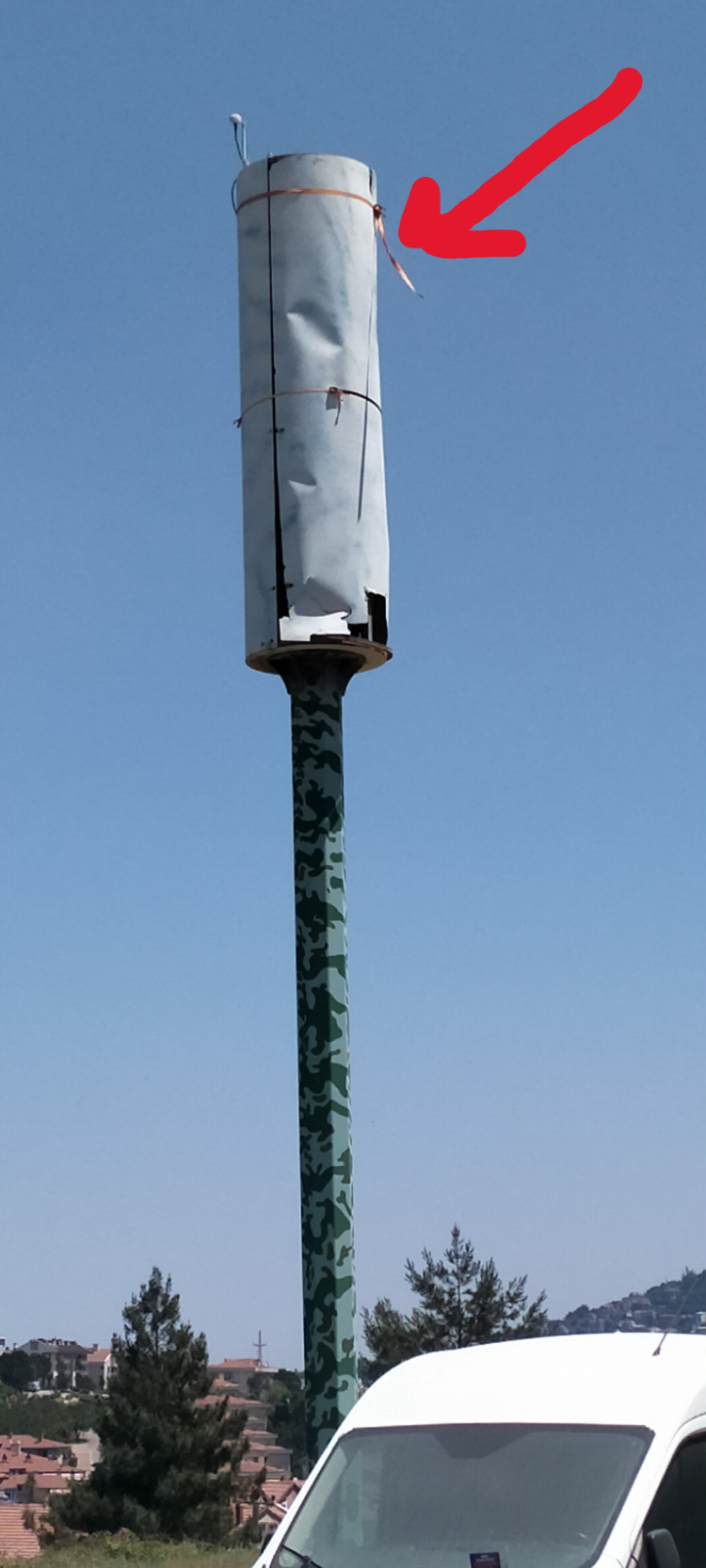 Belirttiğim baz istasyonu için 'kurdelalı baz istasyonu' desek (!) yalan olmaz. Çünkü,istasyon aparatlarını güvenlik içine alan varil şeklindeki koruma kapaklarının belli yerlerinde ciddi deformasyonlar var..