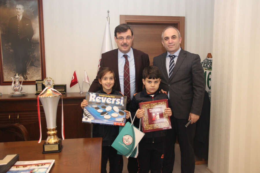 Başarılı öğrencileri, okul müdürleri Serkan Demirci ile birlikte makamında kabul eden İl Milli Eğitim Müdürü Sabahattin Dülger, kazandıkları kupayı kendisine takdim eden minik şampiyonların sevincine ortak oldu.