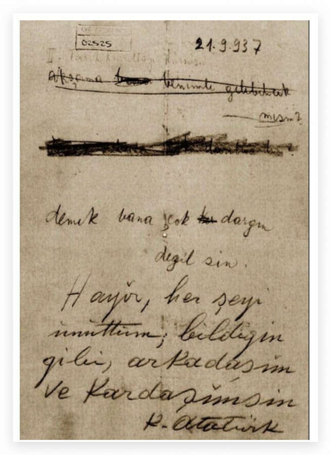 Kurultayda yan yana, aynı locada oturuyorlardı. İnönü bir kağıda "Bana dargın mısın?" diye yazarak Atatürk'e verdi. Atatürk cevaben: "Hayır her şeyi unuttum, bildiğin gibi arkadaşım ve kardeşimsin" yazmıştı. Mesajlaştıkları bu kağıt İsmet İnönü tarafından saklanmıştı ve günümüzde halen muhafaza edilmektedir.