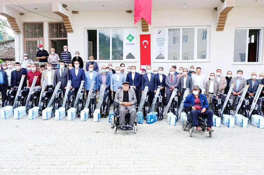Köyde yaşayan yaşlılara dağıtılan engelli arabası ve koltuk değnekleri yaşlıların eli ayağı oldu.
