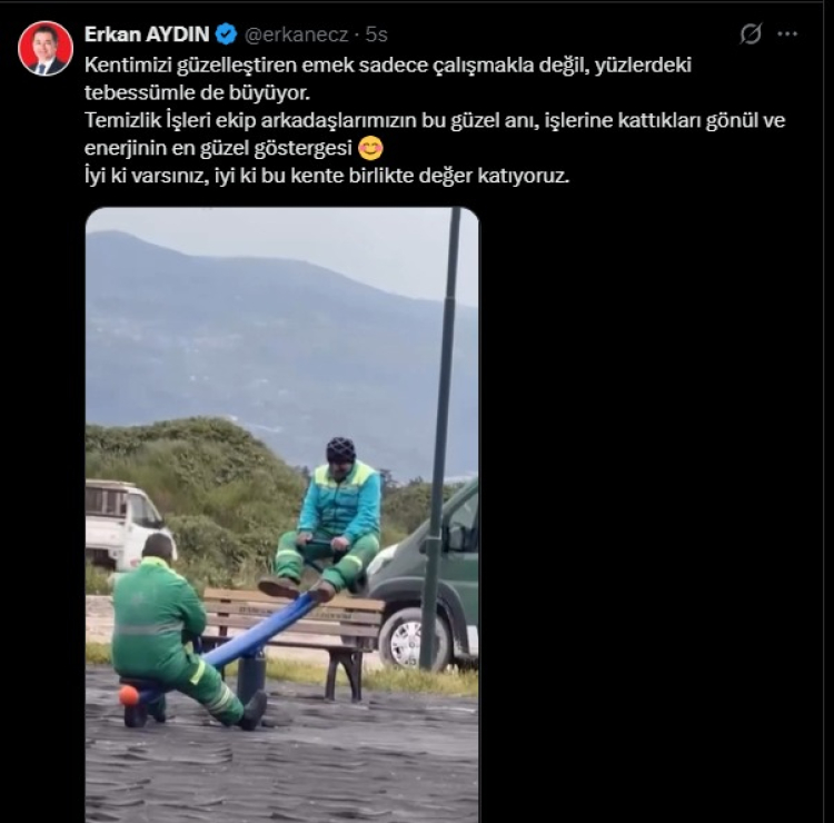Osmangazi Belediye Başkanı Erkan Aydın’ın, temizlik işçilerinin bir çocuk parkında eğlendiği anlara ilişkin sosyal medya paylaşımında bir detay dikkatimi çekti.