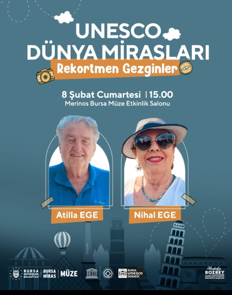 Bursa Büyükşehir Belediyesi ve Bursa UNESCO Derneği ortak organizasyonunda gerçekleşen etkinlikte Rekortmen Gezginler Atilla ve Nihal Ege Dünya Mirasları konusunda bilgiler verdi ve deneyimlerini paylaştılar.