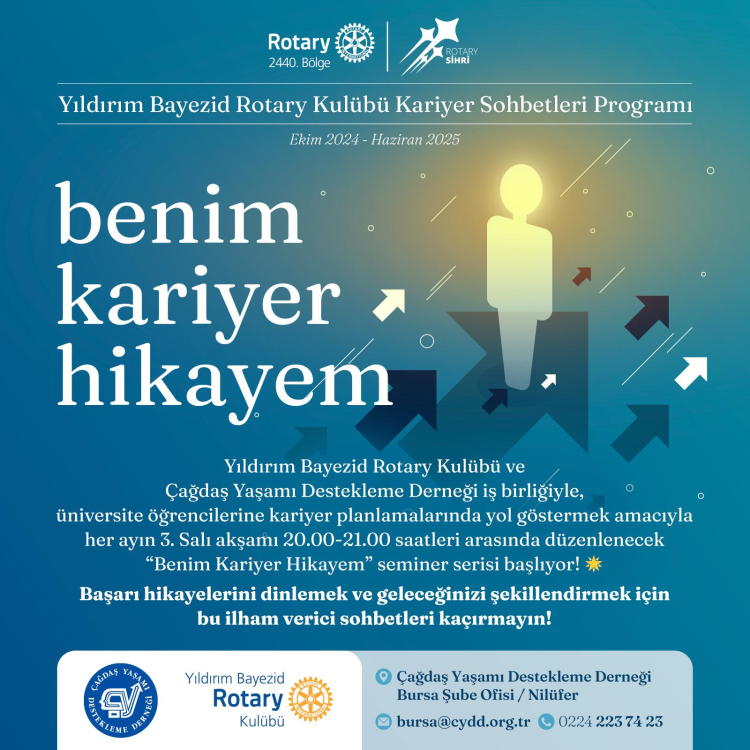 Şimdi ise Yıldırım Bayezid Rotary Kulübü, üniversite öğrencisi gençlerin kariyer planlamasına yön vermek üzere kolları sıvar. Çağdaş Yaşamı Destekleme Derneği ile bu yıl ilk kez imzalanan protokol çerçevesinde Ekim ayında başlayacak olan “Benim Kariyer Hikayem” Kariyer Sohbetleri Projesi ile kulüp üyesi, farklı meslek uzmanı Rotaryenler, üniversite düzeyindeki öğrencilerle, öğrencilik sonrası kariyer hikayelerinin nasıl şekillendiğini paylaşarak, gençlere vizyon kazandırmayı ve çalışma hayatı için motivasyon oluşturmayı hedefler.