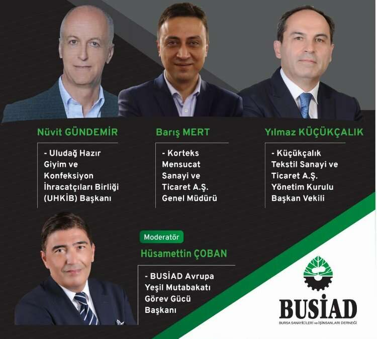 BUSİAD Tekstil Sektörü Çalışma Komitesi’nin etkinliğini BUSİAD Avrupa Yeşil Mutabakatı Görev Gücü Başkanı Hüsamettin Çoban yönetecek. Toplantıda Uludağ Hazır Giyim ve Konfeksiyon İhracatçıları Birliği(UHKİB) Başkanı Nüvit Gündemir, Korteks Genel Müdürü Barış Mert ve Küçükçalık tekstil sahibi Yılmaz Küçükçalık görüşlerini paylaşacak.