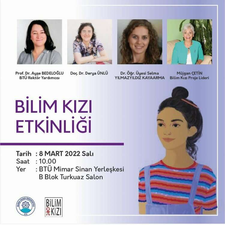 Bilim Kızı Projesi kapsamında 8 Mart’ta Bursa Teknik Üniversitesi’nde bir etkinlik gerçekleşiyor. Burada 3 Bilim Kızı, Bursa’ya geliyor. Etkinlikte saat.10.00’da BTÜ Mimar Sinan Yerleşkesi’nde B Blok Turkuaz Salon’da BTÜ Rektör Yardımcısı Ayşe Bedeloğlu, Doç.Dr.Derya Ünlü ve Dr.Öğr.Üyesi Selma Yılmazyıldız Kayaarma ile Bilim Kızı Projesi Lideri Müjgan Çetin kızlarımıza ve katılımcılara kariyer geçmişlerini paylaşacak. Daha sonra üniversitenin laboratuvarları gezilecek. Bir de sanayi kuruluşlarının Ar Ge’leri gezilecek.