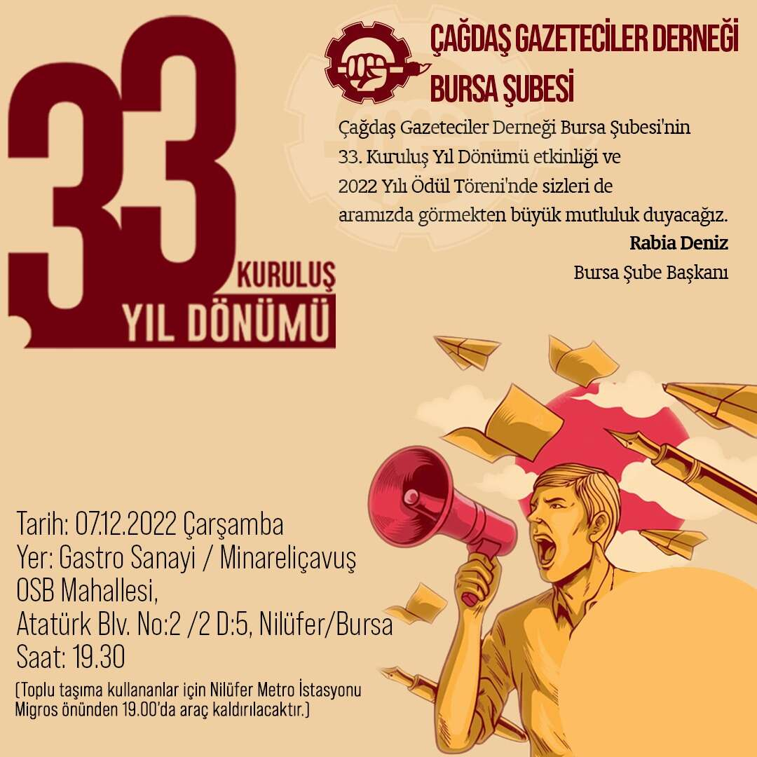 Bugün Çağdaş Gazeteciler Derneği Bursa Şubesi’nin 33. kuruluş yıldönümü. Size biraz o öyküyü anlatmak istiyorum.