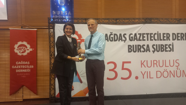 Ayrıca geçtiğimiz yıl başarı ödülüne layık görülen ancak törene katılamayan Gazeteci Timur Soykan’a da ödülü, Çağdaş Gazeteciler Derneği Bursa Şube Başkanı Yüksel Baysal tarafından verildi.