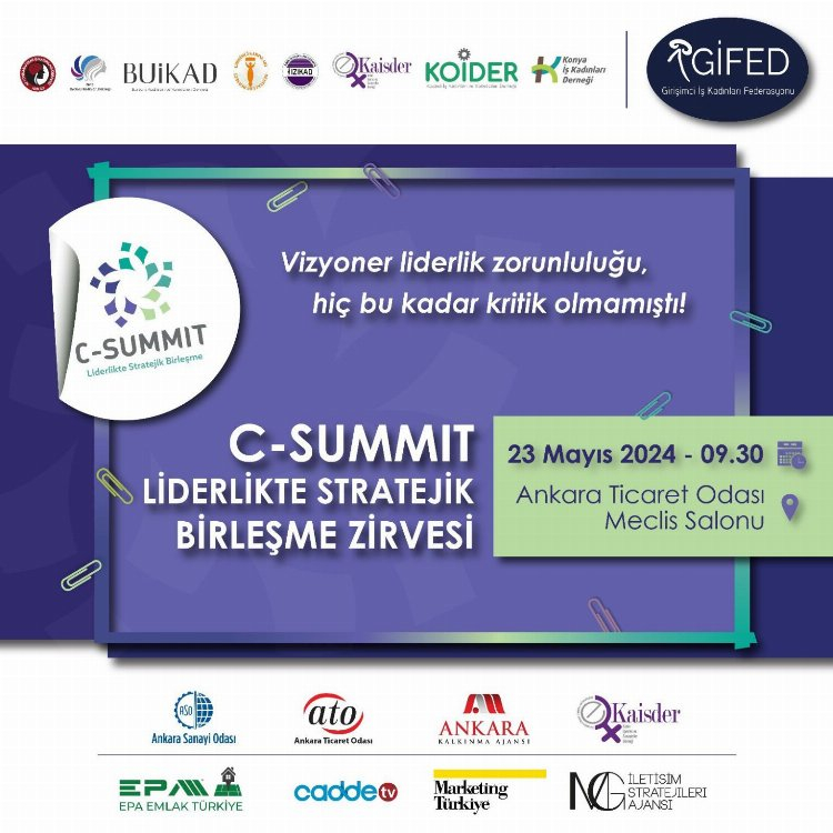 C SUMMIT – Liderlikte Stratejik Birleşme Zirvesi, 23 Mayıs 2024 tarihinde Ankara’da Girişimci İş Kadınları Federasyonu (GİFED) tarafından; Ankara Ticaret Odası ev sahipliğinde, Ankara Sanayi Odası ve Ankara Kalkınma Ajansı destekleriyle düzenleniyor.