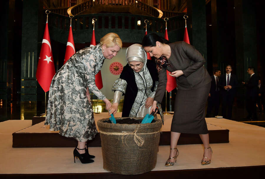 Emine Erdoğan, dokusunda zeytin ağacı tohumu bulunan biyodegredasyon hızı yüksek mendilleri Cumhurbaşkanlığı Külliyesi'nde toprağa gömerek ilk can suyunu da verdi.