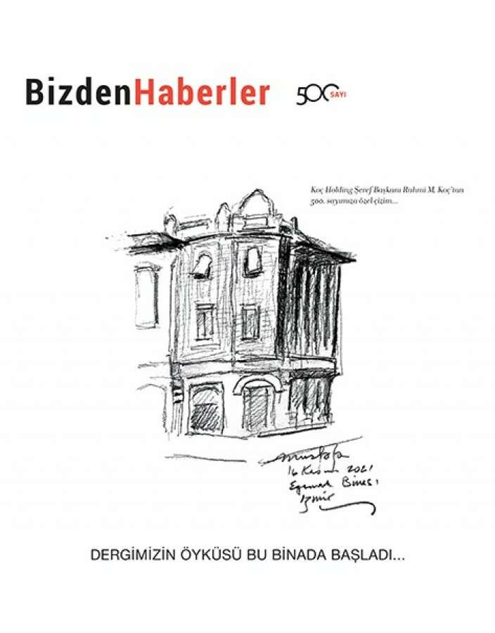 Evet, 58 yıl önce çıkılan bu yolculuk devam ediyor. Geçtiğimiz yılın son sayısı Bizden Haberler'in 500. Özel Sayısı oluyor. Ve bu özel sayının kapağı da özel. Kapakta Koç Holding'in Şeref Başkanı Rahmi Koç'un imzası da bulunan bir özel çizim var. Rahmi Koç bu çizimi "16 Kasım 2021 Egemak binası, İzmir" diye imzalamış.