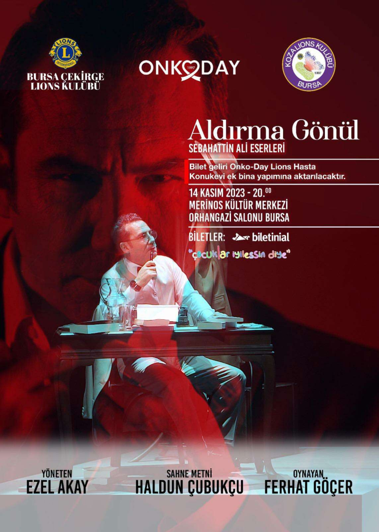 Lions Kulüplerin ve Onkoday’in'Çocuklar iyileşsin diye’ projesi sayesinde, 14 Kasım'da Merinos Kültür Merkezi'nde, Sebahattin Ali eserlerinden oluşan ‘Aldırma gönül’ müzikali ile sizlerle buluşuyorum.