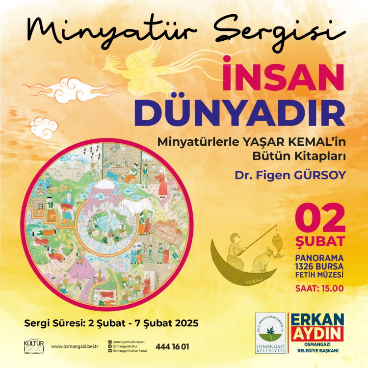 Dr. Figen Gürsoy’un “İnsan Dünyadır. Minyatürlerle Yaşar Kemal’in Tüm Kitapları Minyatür Sergisi” 2-7 Şubat 2025 tarihleri arasında Osmangazi Belediyesi’nin Panorama 1326 Fetih Müzesi’nde gezilebilecektir. Serginin açılışı yarın saat 15.00’te yapılacak.