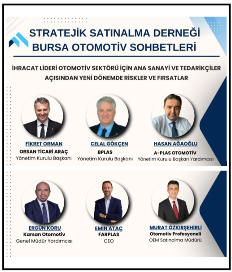 Bu yıl, Stratejik Satınalma Derneği "İhracat Lideri Otomotiv Sektörü İçin Tedarikçiler Açısından Yeni Dönemde Riskler ve Fırsatlar" temasıyla bir Bursa Otomotiv Sohbetleri düzenliyor.