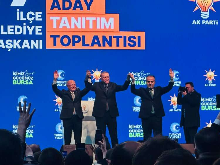 Cumhurbaşkanı Erdoğan konuşmasının ardından AK Parti İl Başkanı Davut Gürkan, MHP İl Başkanı Muhammet Tekin ve Bursa Büyükşehir Belediye Başkanı Alinur Aktaş’ı yanına alarak ilçe belediye başkan adaylarını açıkladı.