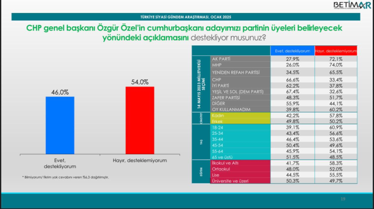 ‘CHP Genel Başkanı Özgür Özel’in Cumhurbaşkanı adayımızı partinin üyeleri belirleyecek yönündeki açıklamaları’ destekliyor musunuz’ sorusuna katılımcılardan yüzde 54’ü hayır, yüzde 46’sı da evet yanıtını verdi.