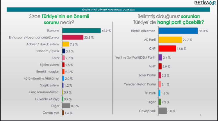 Bu sorunun devamı niteliğindeki ‘Belirtmiş olduğunuz sorunları Türkiye’de hangi parti çözebilir’ sorusuna verilen yanıtta ise yüzde 38 oranıyla ‘hiçbiri çözemez’ ilk sırada yer alırken, Çözümün adresini AK Parti olarak görenlerin oranı yüzde 22,7, CHP ise yüzde 16,8 olarak çıktı.