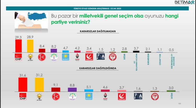 Pazar günü seçim olsa sorusundaki oy tercihlerinde ise kararsızlar dağıtıldıktan sonra CHP yüzde 31,6 ile ilk sırada AK Parti yüzde 31,2 ile ikinci, MHP yüzde 9,1 ile üçüncü DEM ise yüzde 8,8 ile dördüncü sırada yer aldı.