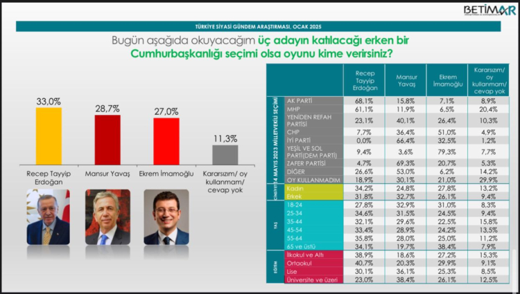 Ankette üç adaylı erken bir cumhurbaşkanlığı seçiminde seçmenin tercihinin ne olduğu da soruldu. Erdoğan yüzde 33 ile ilk sırada yer alırken, Yavaş 28,7 ile ikinci, İmamoğlu ise yüzde 27 ile üçüncü sırada yer aldı.