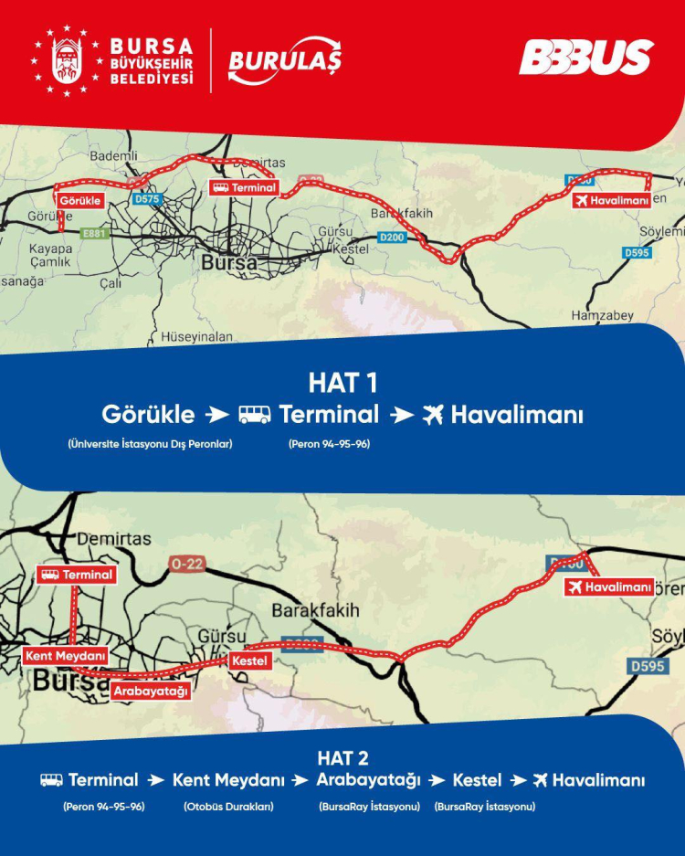 Dün itibarıyla Bursa Büyükşehir Belediyesi’nin BBBUS araçları Yenişehir Havalimanı’na seferlere başladı.