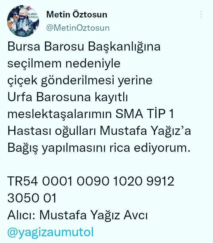 Metin Öztosun, seçilmesinin ardından sosyal medya hesabından bir çağrı yaptı. Seçimi kazanması dolayısıyla çiçek gönderilmesi yerine Şanlıurfa Barosu’na kayıtlı meslektaşlarının SMA TİP 1 hastası oğulları Mustafa Yağız’a bağış yapılmasını isteyen Öztosun, Mustafa Yağız için açılan kampanyanın iban numarasını paylaştı.