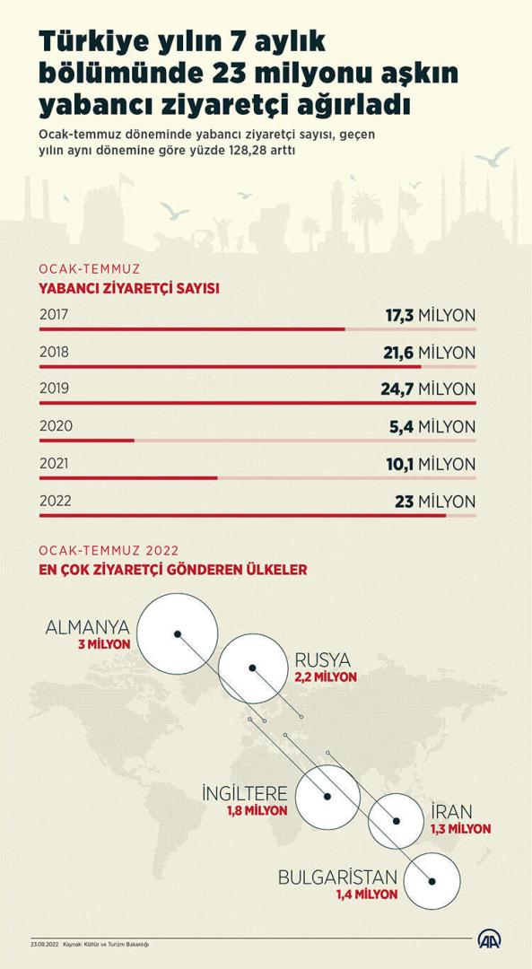 Geçtiğimiz hafta, Kültür ve Turizm Bakanlığı, yılın ocak-temmuz döneminde ülkeye gelen ziyaretçi sayılarına ilişkin verileri paylaştı. Buna göre, yabancı ziyaretçi sayısı, ocak-temmuz döneminde geçen yılın 7 aylık dönemine göre yüzde 128,28 artarak 23 milyon 30 bin 209 oldu. Buna Türkiye'ye gelen 3 milyon 165 bin 538 yurt dışı ikametli vatandaşla birlikte toplam 26 milyon 195 bin 747 ziyaretçi ağırlandı.