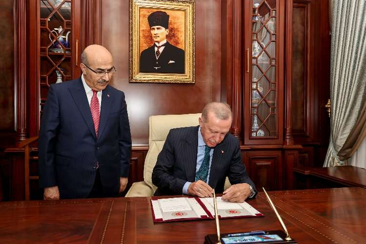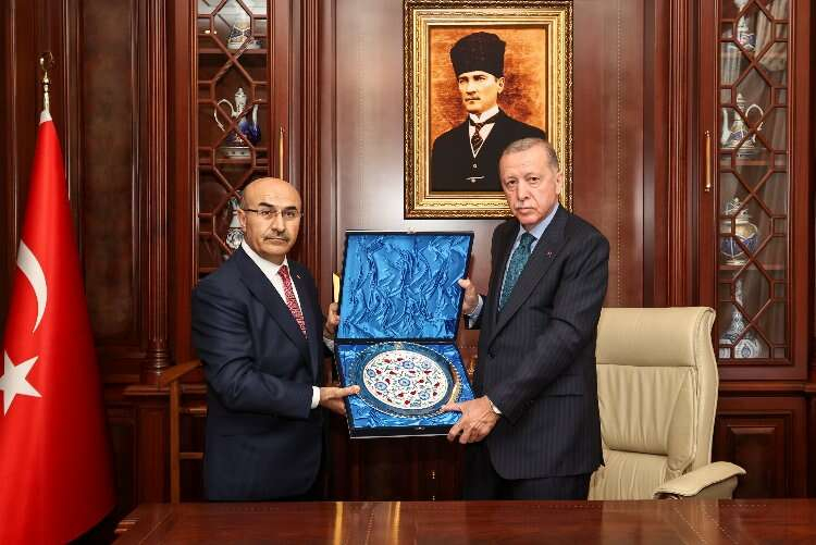 Vali Demirtaş, Erdoğan’a İznik çinisi hediye ederken, Erdoğan da şeref defterini imzaladı.