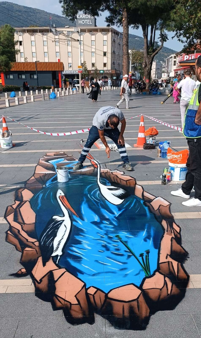 Mudanya sahilinde betondan fırlayan yunuslar, Kent Meydanı’ndaki kuğu, Heykel Nalbantoğlu Çarşısı'ndaki kedi, Orhangazi Meydanı’ndaki Kelebek ve Zafer Palaza Meydanı’daki optik illüzyon çalışmaları görenleri şaşkına çeviriyor.