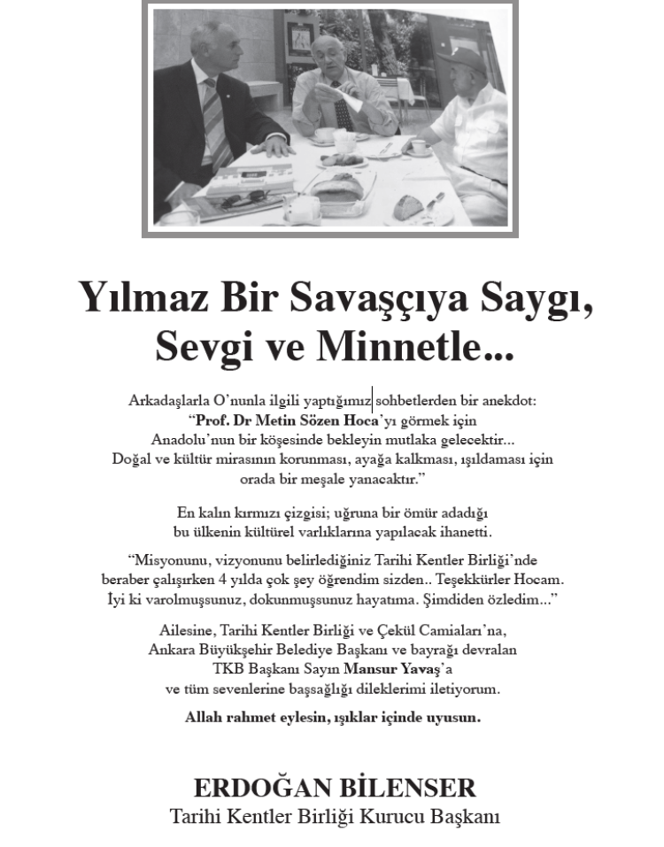1999-20024 yılları arasında Bursa Büyükşehir Belediye Başkanlığı yapan Tarihi Kentler Birliği’nin kurucu başkanı Erdoğan Bilenser, vefatının ardından yayımladığı mesajda şöyle dedi: