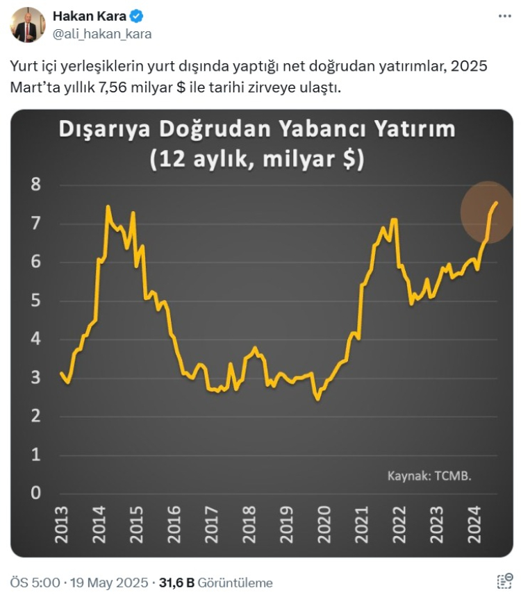"Yurt içi yerleşiklerin yurt dışında yaptığı net doğrudan yatırımlar, 2025 Mart’ta yıllık 7,56 milyar dolar ile tarihi zirveye ulaştı."