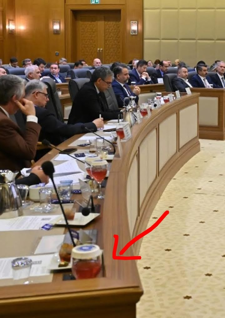 Diye düşünürken, oturumdan çekilmiş fotoğraflardaki bir ayrıntı dikkatimi çekti, hemen her meclis üyesinin önündeki bardaklarda kırmızı renkli bir içecek duruyordu!