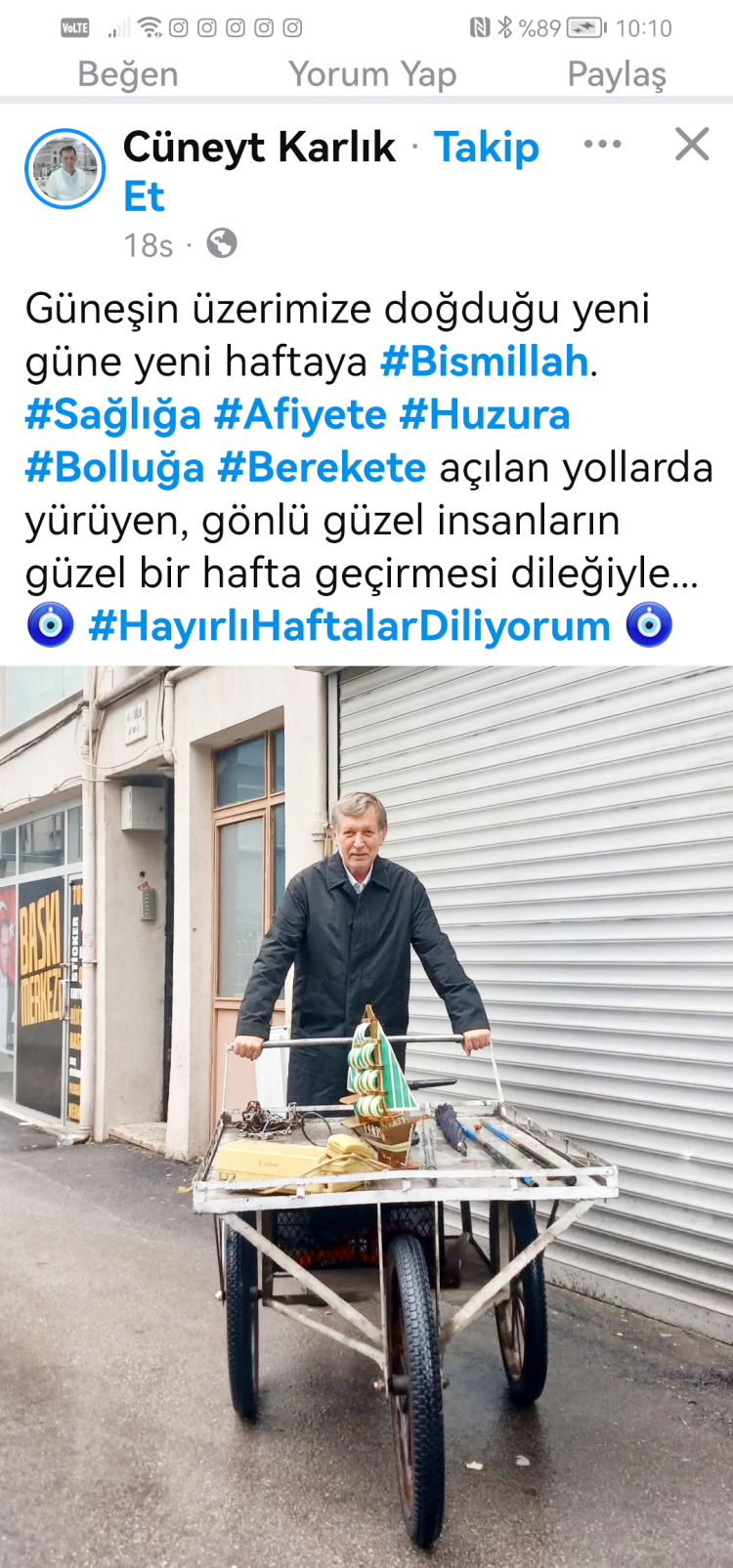 Geçmiş dönemlerde Yıldırım Belediye Başkanlığı yapan Cüneyt Karlık, elinde pazarcı arabasıyla bir fotoğraf paylaşmış.