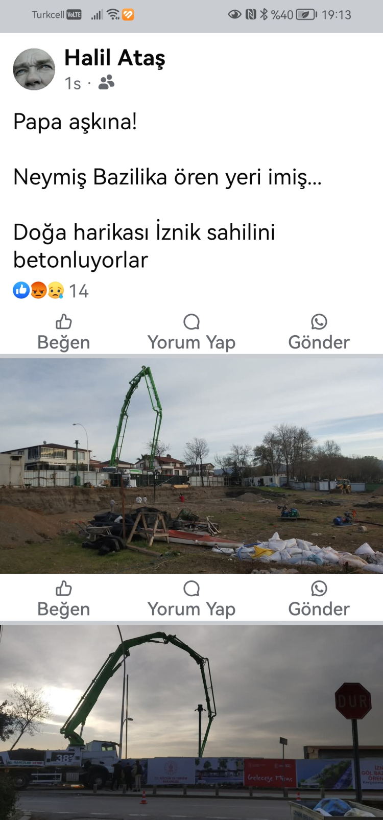 “Papa aşkına” başlığıyla yaptığı paylaşımında her geçen gün suları biraz daha çekilen İznik Gölü'nde ortaya çıkan bazilikaya da vurgu yaparak tepkisini şu sözlerle dile getiriyor: